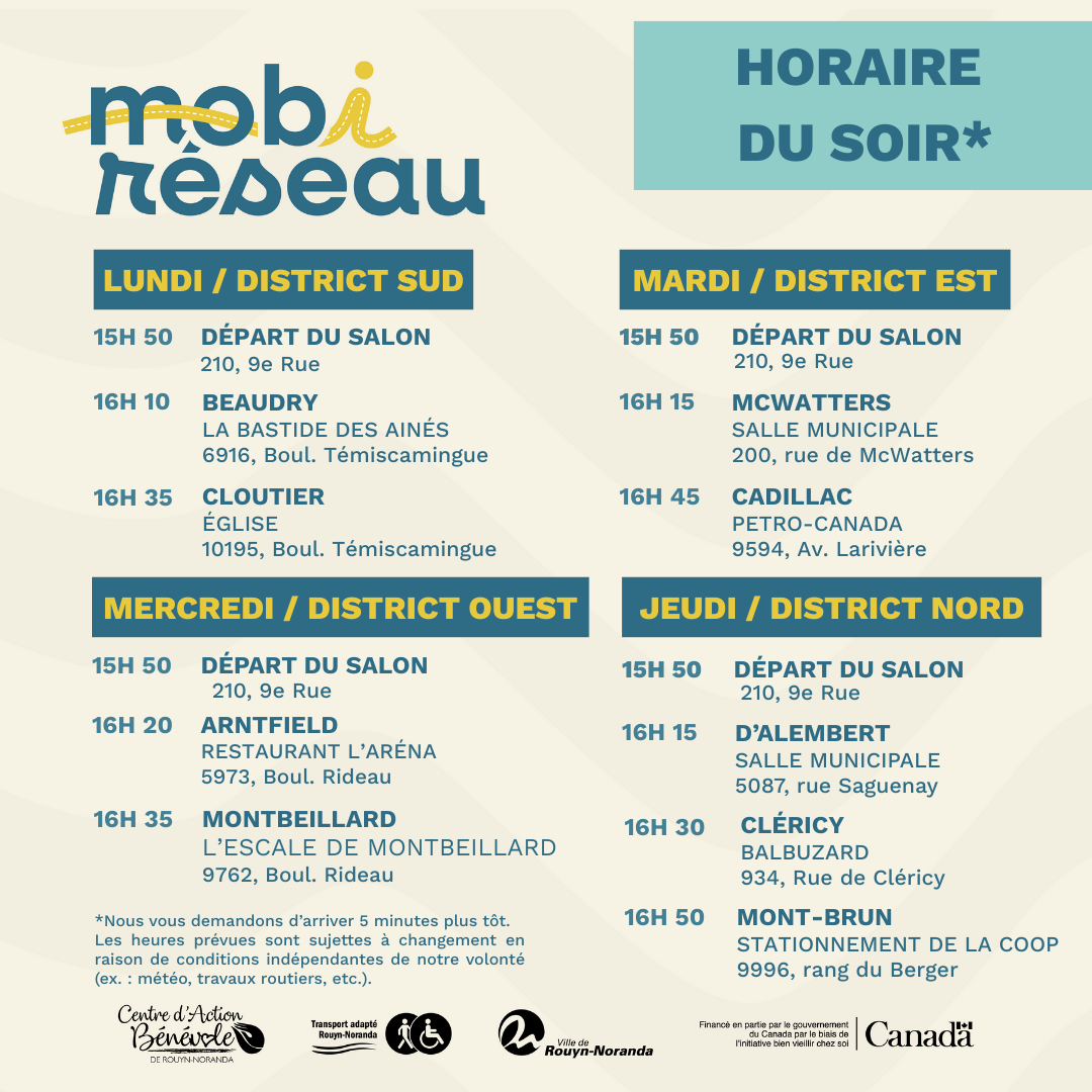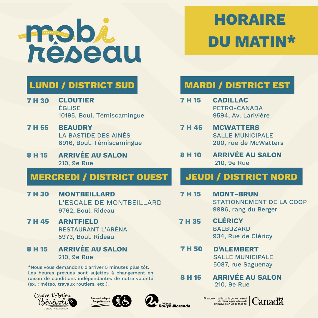 Le Mobiréseau est un service de transport collectif destiné aux quartiers ruraux de Rouyn-Noranda.Il mise sur la force des réseaux d’entraide bénévole pour bonifier la mobilité et encourager l’entraide locale. Propulsé par le Centre d’action bénévole de Rouyn-Noranda en collaboration avec Transport adapté et la Ville de Rouyn-Noranda, ce projet pilote permet aux résidents ruraux de rejoindre gratuitement le centre-ville. Durant toute la phase pilote, le service sera offert gratuitement afin d’en maximiser l’accessibilité. Cette initiative est rendue possible grâce au soutien financier d’Emploi et Développement social Canada. Ce service est gratuit et la réservation est nécessaire puisque les places sont limitées. Les douze quartiers ruraux de Rouyn-Noranda sont séparés en 4 districts différents soit : District Nord : Mont-Brun, Cléricy, D'Alembert et Destor* District Sud : Cloutier, Beaudry et Bellecombe* District Est : Cadillac et McWatters District Ouest : Montbeillard, Arntfield et Rollet* *Aucun arrêt n'est prévu pour la phase 1 du projet dans les quartiers de Destor, Bellecombe et Rollet. Nous vous invitons à contacter le réseau d'entraide pour toute question. Pour effectuer une réservation, il vous suffit de cliquer sur l'onglet correspondant à votre district. |